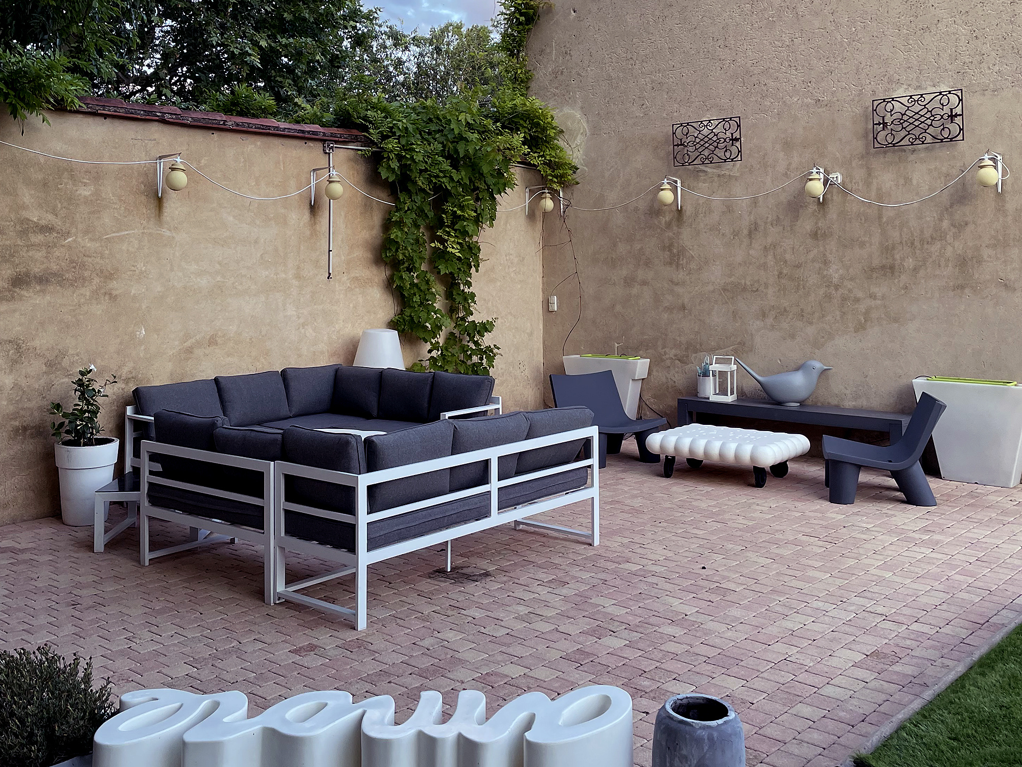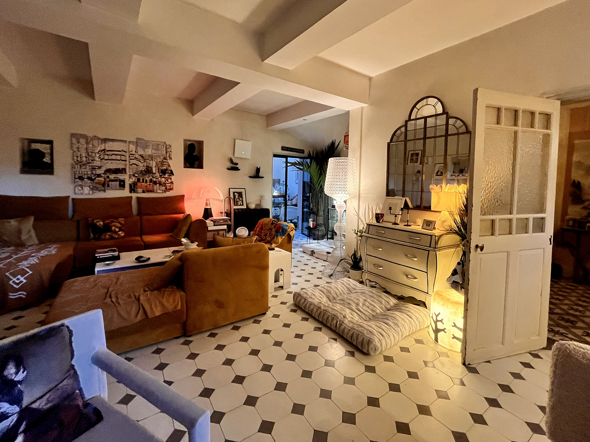 Les espaces de vie sont composés d'une cuisine, d'un patio central très surprenant et de plusieurs salons auxquels s'ajoutent des espaces extérieurs et/ou salon d'hiver.