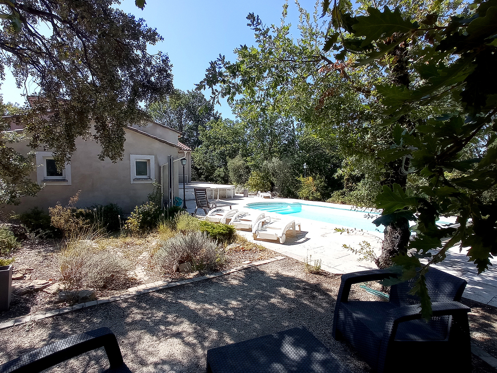 Le jardin de 1000 m² avec piscine et à l'abri des regards est orienté Ouest et ménage un bel espace de stationnement bien détaché des espaces de détente. Le plus, une dépendance attenante de 18 m² reste à aménager et donne directement sur l'espace piscine.