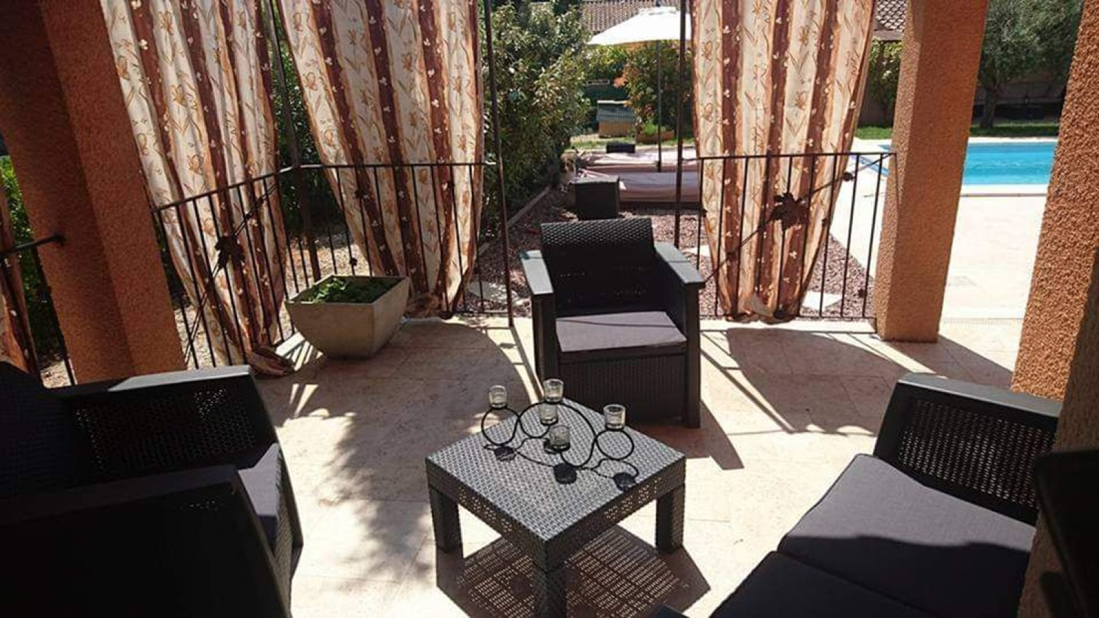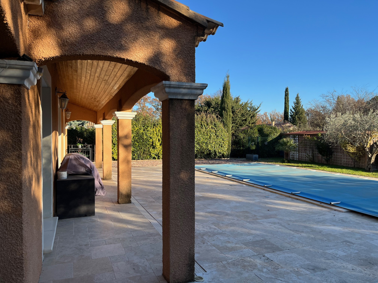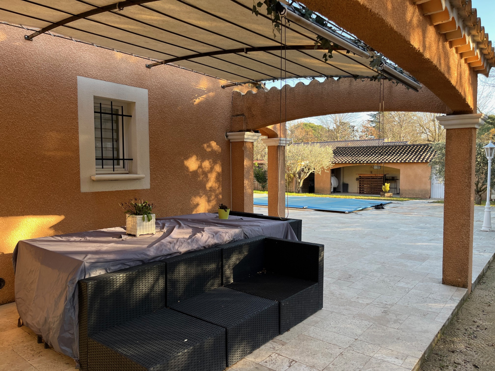 Mazan (84380)Vendu par LG Immobilier - Un emplacement recherché et attractif, au calme, pour cette charmante villa de plain-pied avec prestations de qualité. Spacieux hall d'entrée, un agréable espace de vie d’env.33m², baigné de lumière par ses larges baies vitrées, une cuisine équipée d’env.11m², 3 chambres (d’env.12, 11 et 9 m²), un dressing, toilette séparée, une grande salle d’eau avec douche à l’italienne, double vasques et baignoire, un cellier, un grand garage d’env.40m². Plusieurs terrasses ombragées invitent à la détente autour de la piscine. Beau jardin (parcelle d'env.1 300m²), entièrement clos et arboré. Le vaste parking est sécurisé par un portail automatique et vidéophone.