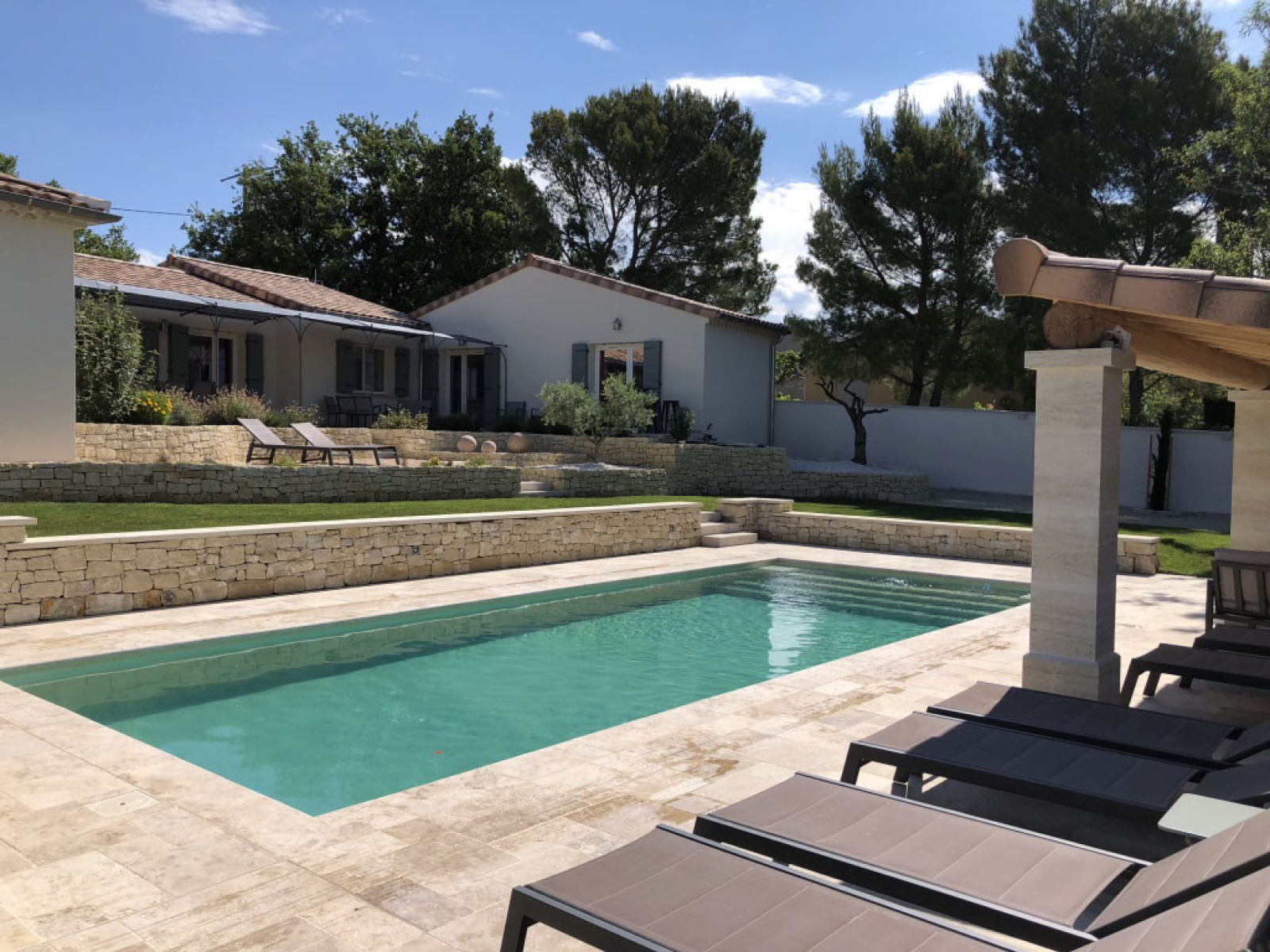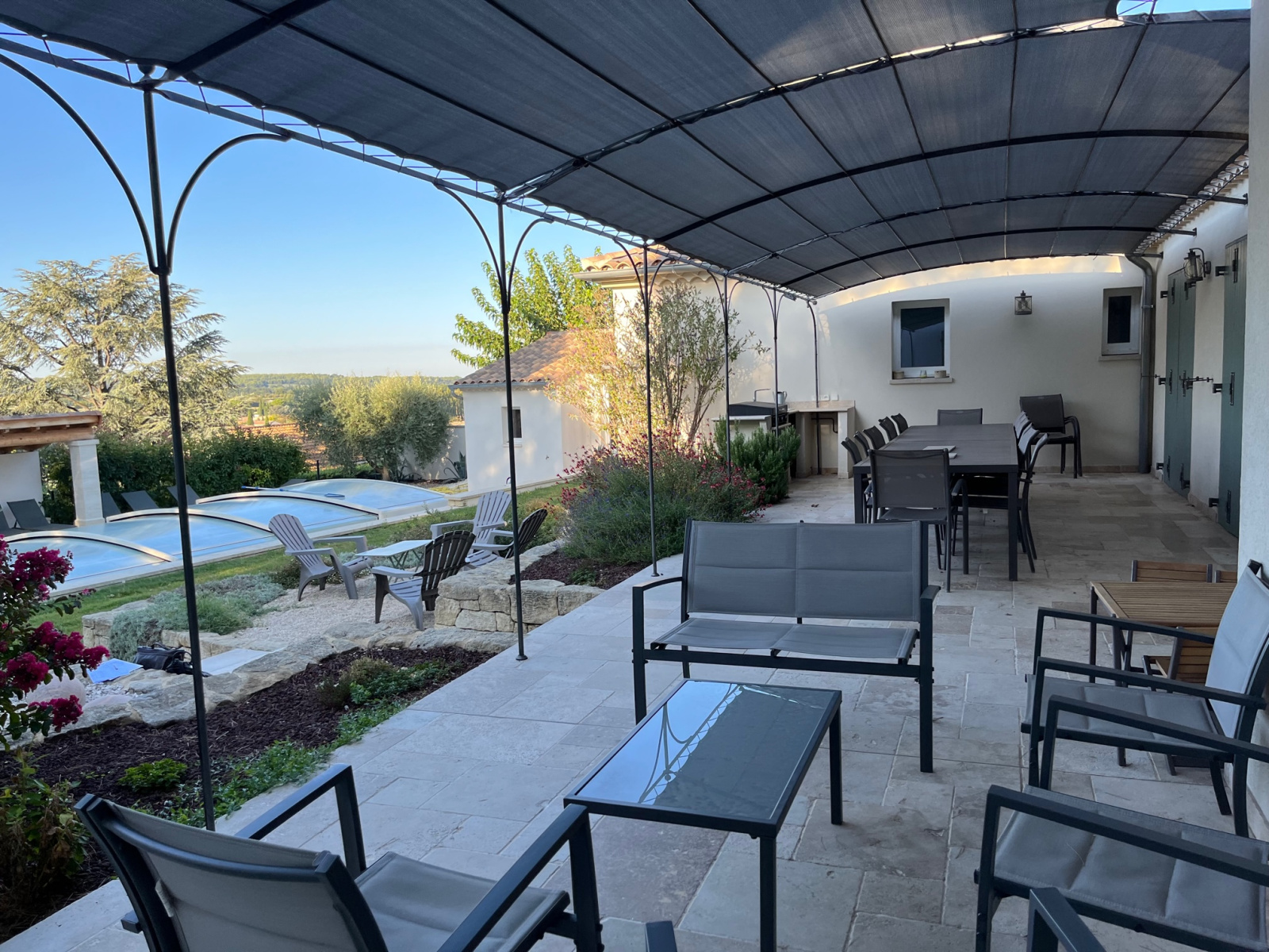 Jardin paysagé. Grande terrasse sous tonnelle, avec un auvent à côté de la piscine, jeux de boules. Pisine et abris.