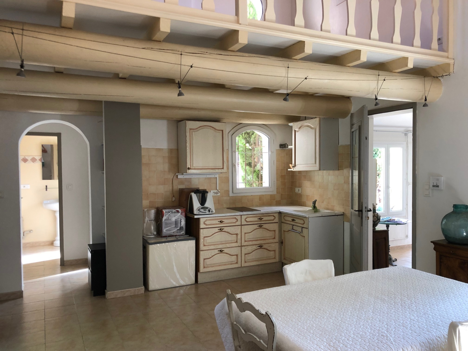 Un appartement d’env.65m² s’organise autour d’un hall (10m²), un séjour avec coin cuisine, une chambre avec sa salle d’eau + wc et à l’étage une chambre sur mezzanine d’env. 12m². Ces 2 logements profitent d’espaces extérieures séparés. Se rajoute encore une annexe d'env.25m² pouvant faire office de studio avec coin cuisine et salle d’eau.