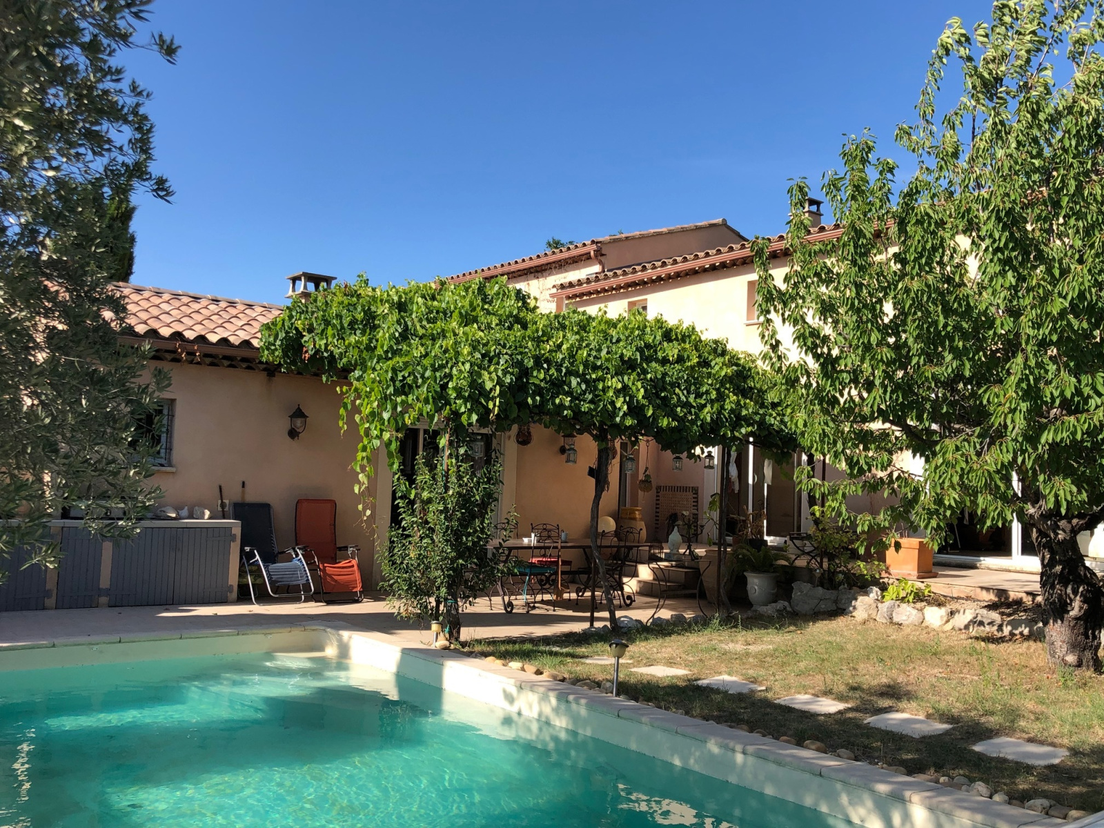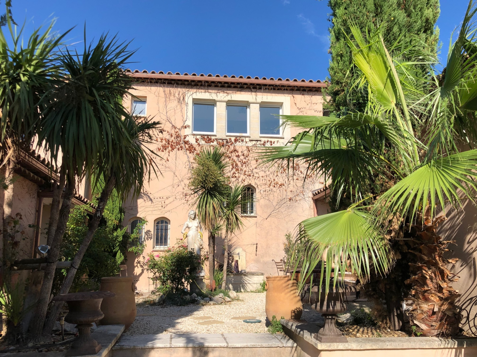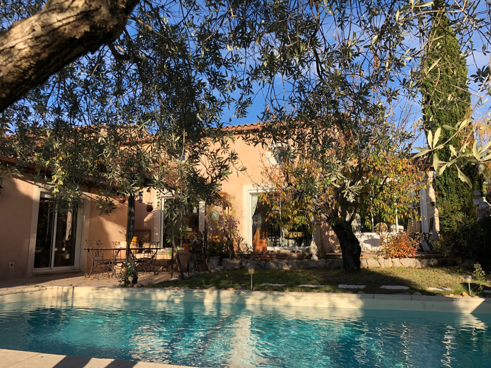 Le jardin privé s’articule avec de nombreuses terrasses autour de la piscine et un patio d'env.65m². Belles prestations : plafonds rampants et poutres apparentes, cheminée en pierres avec insert, baies coulissantes, l’eau du canal, un portail automatique avec portillon, des oliviers, palmiers et autres essences locales, donnant un cachet atypique et chaleureux à ce bien, à 2 pas des commerces du village.
