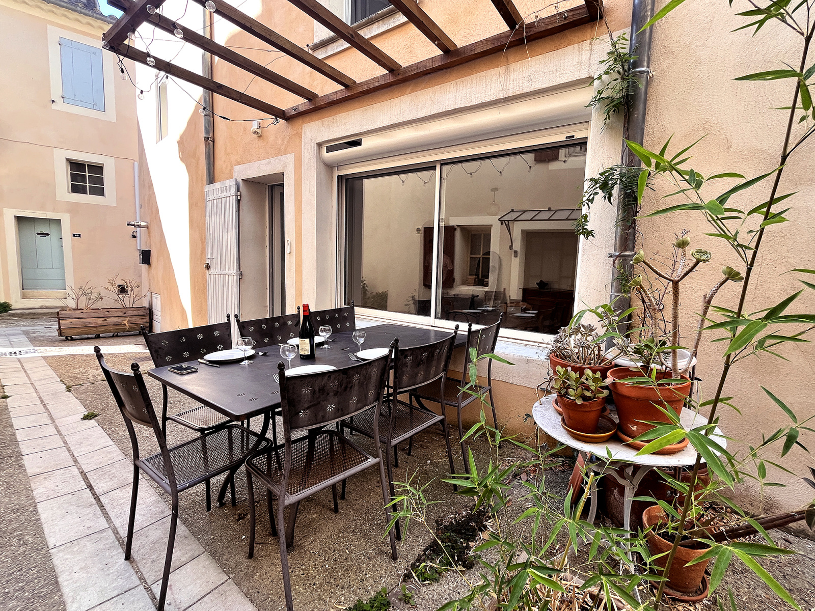 Au RDC, un espace cuisine avec son arrière cuisine, une salle à manger donnant sur une impasse partagée et conviviale, un salon.